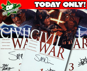 Today we have 3 Civil War titles featuring 5 signatures for only $29.99! You'll receive Civil War #1 signed by Joe Simon and Steve McNiven, Civil War #3 signed by Joe Simon and Civil War #3 signed by Steve McNiven and John Romita! *CIVIL WAR #1 SIGNED BY JOE SIMON AND STEVE MCNIVEN *CIVIL WAR #3 SIGNED BY JOE SIMON *CIVIL WAR #3 ... |