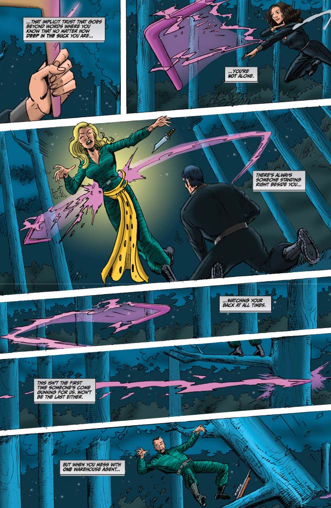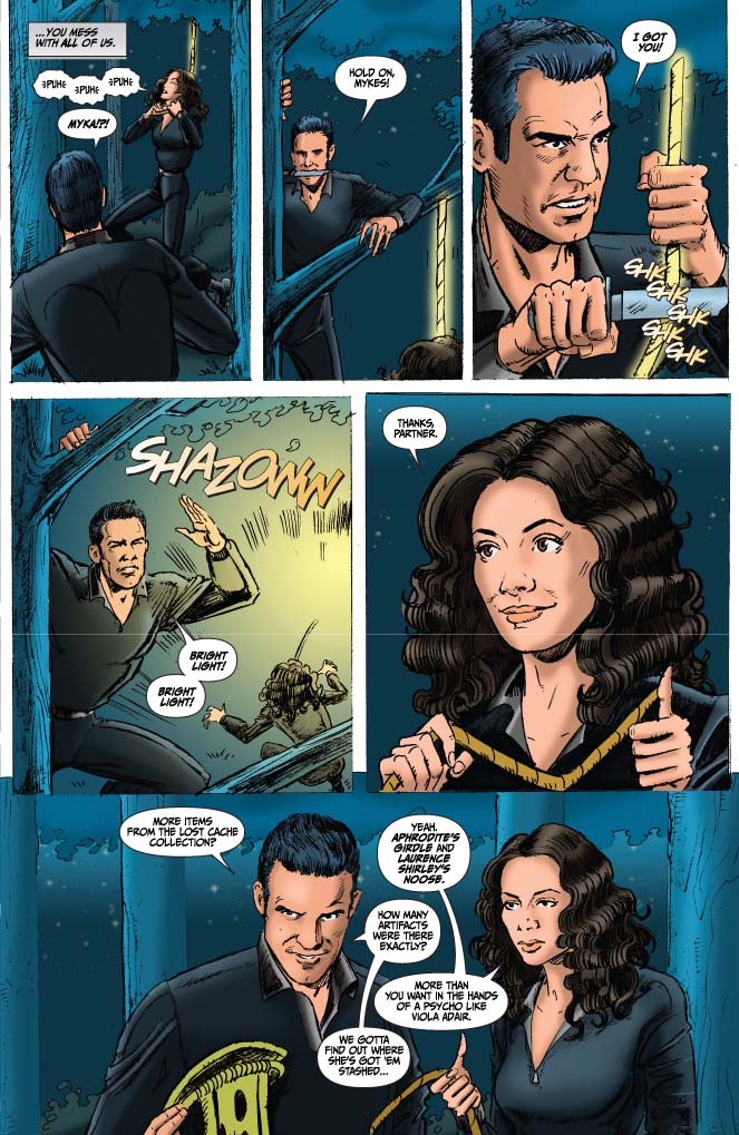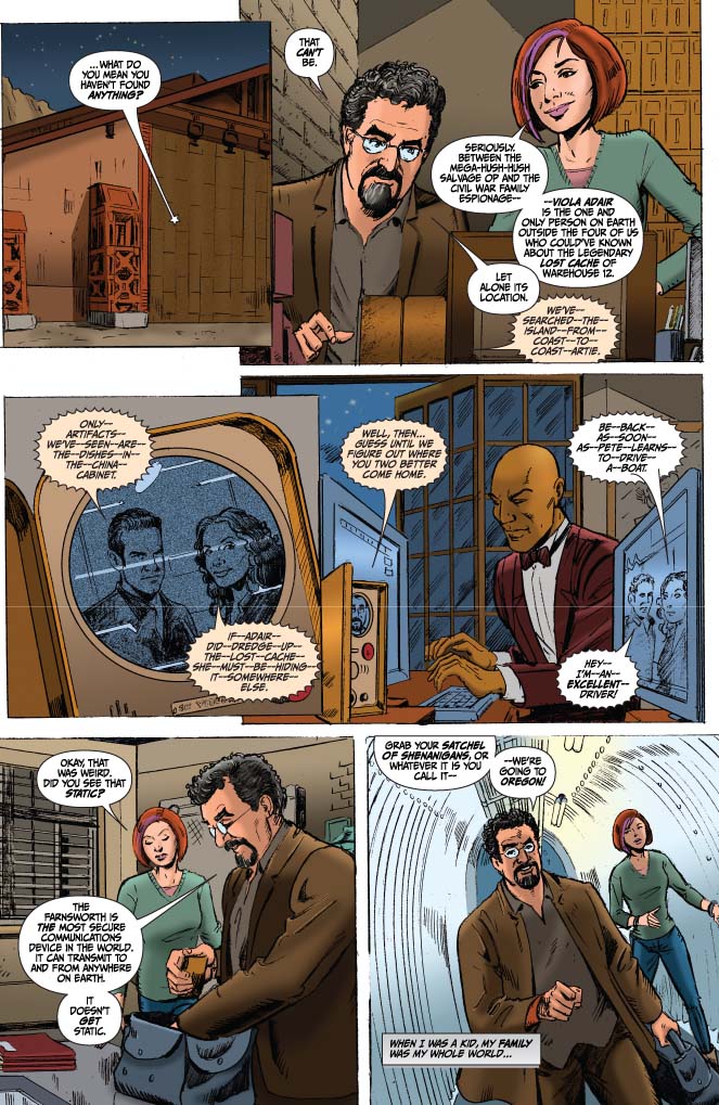 Rating: Teen + Covers: Ben Morse (50% - 00511), Photo Cover (50% - 00521) Writer: Ben Raab and Deric A. Hughes Artist: Ben Morse Colorist: Ben Morse Genre: Media Tie-In, Sci-Fi Awards: N/A Publication Date: Dec 2011 Format: Comic Book Page Count: 32 pages Rights: WW Age range: 16+ UPC: 725130184092 Pawns in a deadly game of survival, Pete and Myka prove why they're the best of the best by turning the tables and taking the fight to their captor, the beautiful-but-deadly Viola Adair. Little do they realize Viola's got an artifact ace up her sleeve. Once its terrible power is unleashed, can even the combined might of the Warehouse team stop it? Find out in the pulse-pounding conclusion of WAREHOUSE 13! |