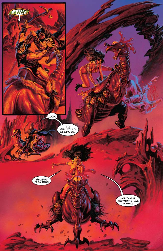 Rating: Teen + Cover: Joe Jusko Writer: James Robinson Artist: Joe Jusko, Rick Mays and David Mack Awards: N/A Publication Date: Oct 2011 Format: soft cover trade paperback Page Count: 112+ pages Collecting James Robinson's and Joe Jusko's sense shattering tale Blood Lust as Vampirella journeys to hell with Adam Van Helsing to uncover the truth of her existence. This tale re-wrote the book on Vampirella and her homeland of Drakulon. Also includes the Blood Lust epilogue originally not released with the original two issue series and an article which covers how Joe Jusko worked from the script and thumbnailed, drafted and then painted some sample pages. Also includes James Robinson's short Vampirella tale "Vampirella Vs. Dracula" with art by Rick Mays and David Mack.