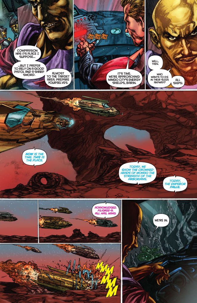 Rating: Teen + Covers: Alex Ross, Francesco Francavilla (1-in-10) Writer: Eric Trautmann Artist: Daniel Indro Genre: Sci-Fi Awards: N/A Publication Date: May 2012 Format: Comic Book Page Count: 32 pages Rights: WW Age range: 16+ UPC: 725130183958 00711 UPC: 725130183958 00721 UPC: 725130183958 00731 As Ming prepares for the final offensive against the Earth, Flash Gordon -- and allies both new and old -- moves against Ming's palace. Fighting alongside his fellow Earthmen, the brilliant Dr. Zarkov and the beautiful Dale Arden, Gordon leads a rebel band into the teeth of Ming's fearsome defenses. But will even the universe's greatest hero be in time? |