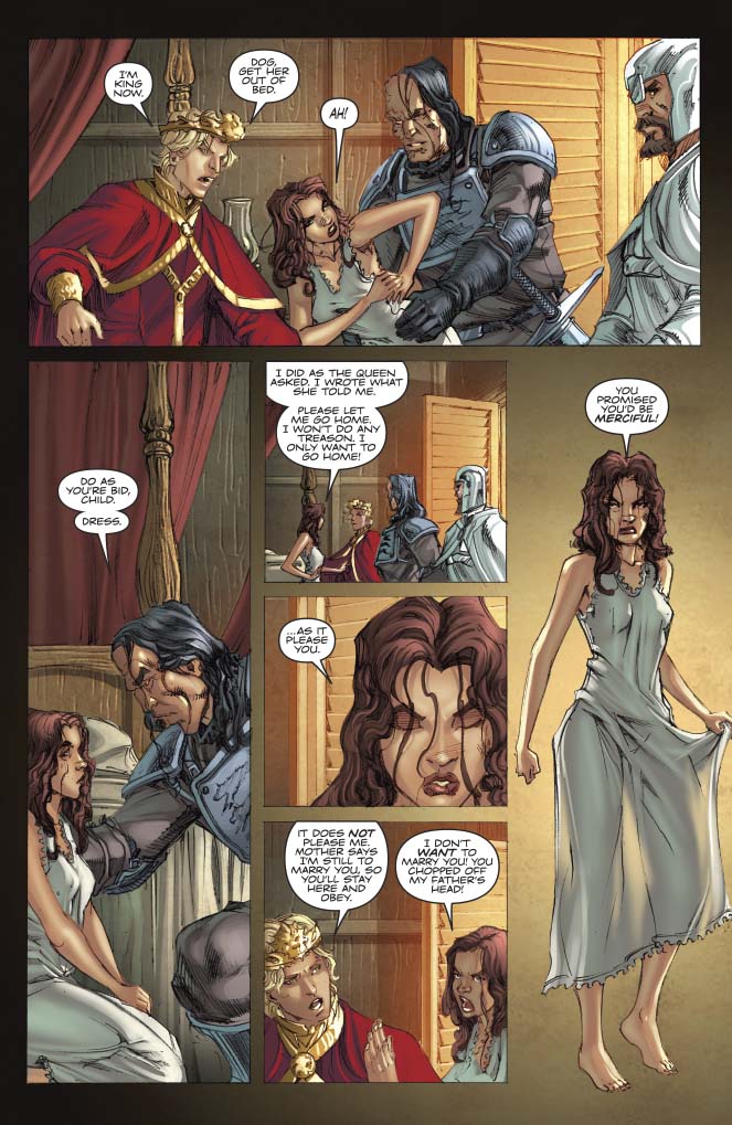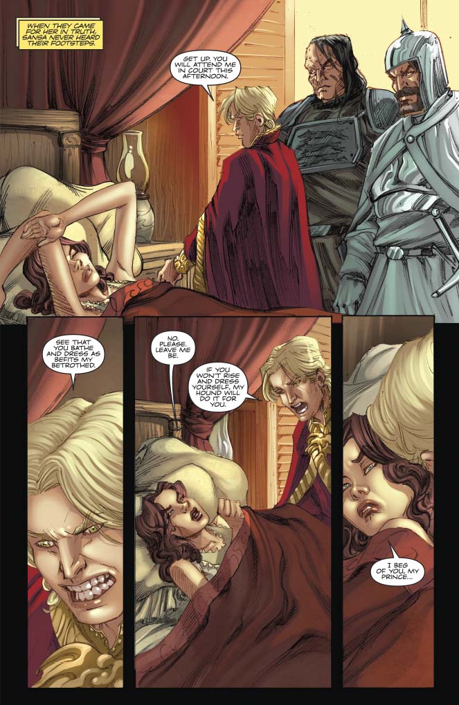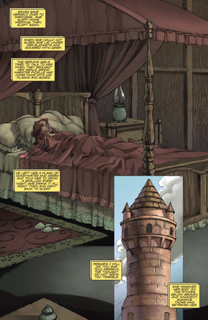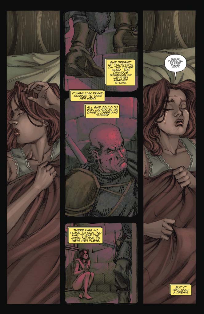 Rating: Mature Covers: Mike S. Miller Writer: George R.R. Martin, Daniel Abraham Artist: Tommy Patterson Genre: Fantasy Publication Date: Dec 2013 Format: Comic Book Page Count: 32 pages UPC: 725130183996 02211 ON SALE DATE: December 18 Drogo is dying of his wounds. Daenerys will do anything to save him, even if it means embracing forbidden bloodmagic. But such spells carry a deadly price and, as the pregnant Dany is about to learn, that price can be far harder to bear than any graveside grieving. Now Sansa Stark, still betrothed to the mad young King Joffrey, yet no longer in love with him, finds herself as much a prisoner as Lord Eddard was, facing a fate as cruel and capricious . . . and as final. |