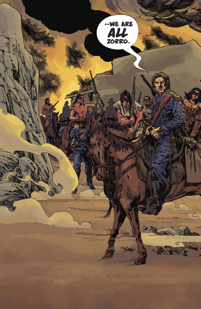 Rating: Teen + Covers: Joseph Michael Linsner Writer: Alex De Campi Art: Rey Villegas Genre: Action/Adventure Publication Date: Oct 2014 Format: Comic Book Page Count: 32 pages UPC: 725130216892 04011 ON SALE DATE: October 22 It's war. In the smoking ruins of what was a thriving Spanish village only a few days before, the Spanish patriots and Chumash Warriors prepare to fight a well-trained, well-equipped army of German mercenaries. As the battle begins, Lady Zorro and Hugo gallop off on a last-ditch effort to avert the full-on massacre of the defenders. But the evil German general sees through Lady Zorro's plan, and has a bullet for all her troubles. This is the end for Alta California as we know it... and Lady Zorro. |