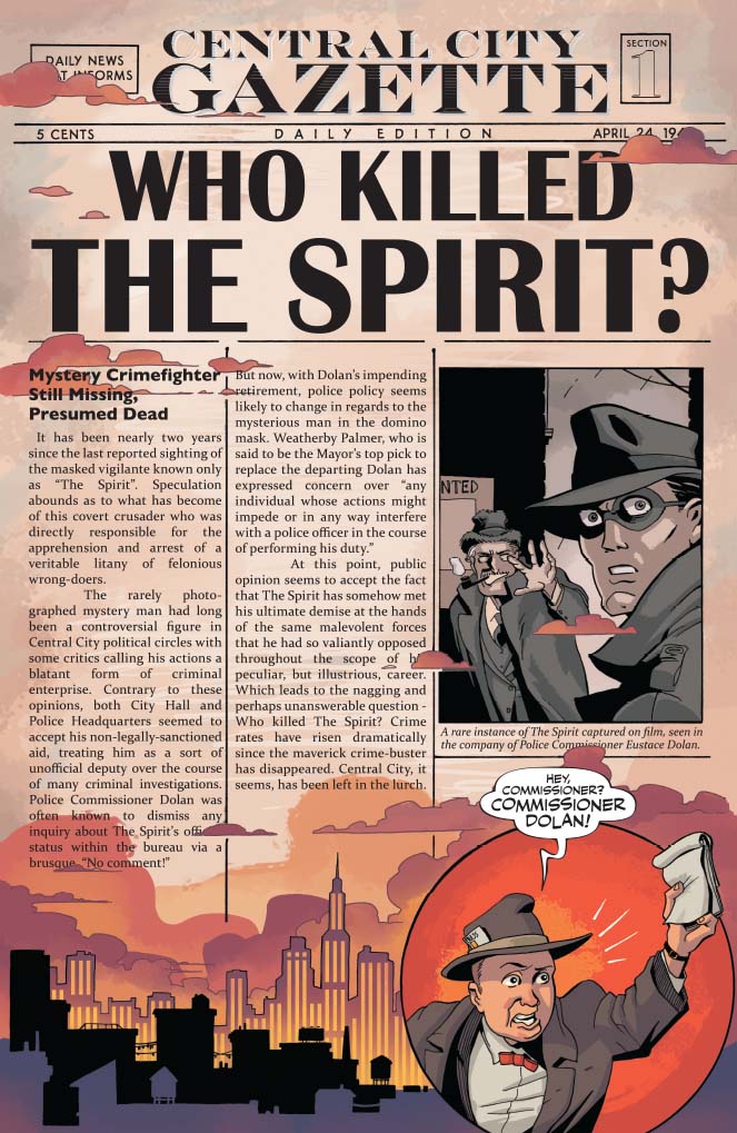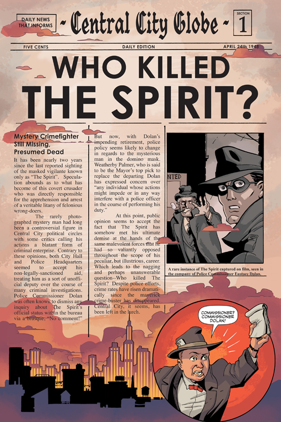 Rating: Teen + Cover A: Eric Powell UPC: 725130235084 01011 Cover B: Matt Wagner, Brennan Wagner UPC: 725130235084 01021 Writer: Matt Wagner Art: Dan Schkade, Brennan Wagner Genre: Crime Noir, Superhero Publication Date: July 2015 Format: Comic Book Page Count: 32 pages ON SALE DATE: July 1 In celebration of the 75th anniversary of Will Eisner's iconic and ground-breaking character, DYNAMITE ENTERTAINMENT is proud to present an all-new ongoing series featuring THE SPIRIT. Scripted by Eisner Award-winning author, Matt Wagner, this monthly title will delight longtime fans as well as help introduce a whole new generation of fans to the character. Set in the classic period of The Spirit's golden age, the 1940s, the first 12-issue story arc follows the strip's most beloved characters, Commissioner Dolan, his daughter Ellen, Ebony White and Sammy as they attempt to uncover why The Spirit has been missing, and presumed dead, for the past two years. Has the famous blue-masked hero finally fallen victim to one of the malicious felons or beautiful femme fatales from his lengthy rogues' gallery of enemies? In the words of Central City's most prominent headlines: "WHO KILLED THE SPIRIT?" Illustrated by Dan Schkade and colored by Brennan Wagner, this series will strive to honor the vital and prestigious legacy of one of comicdom's most talented and influential creators - Will Eisner. |