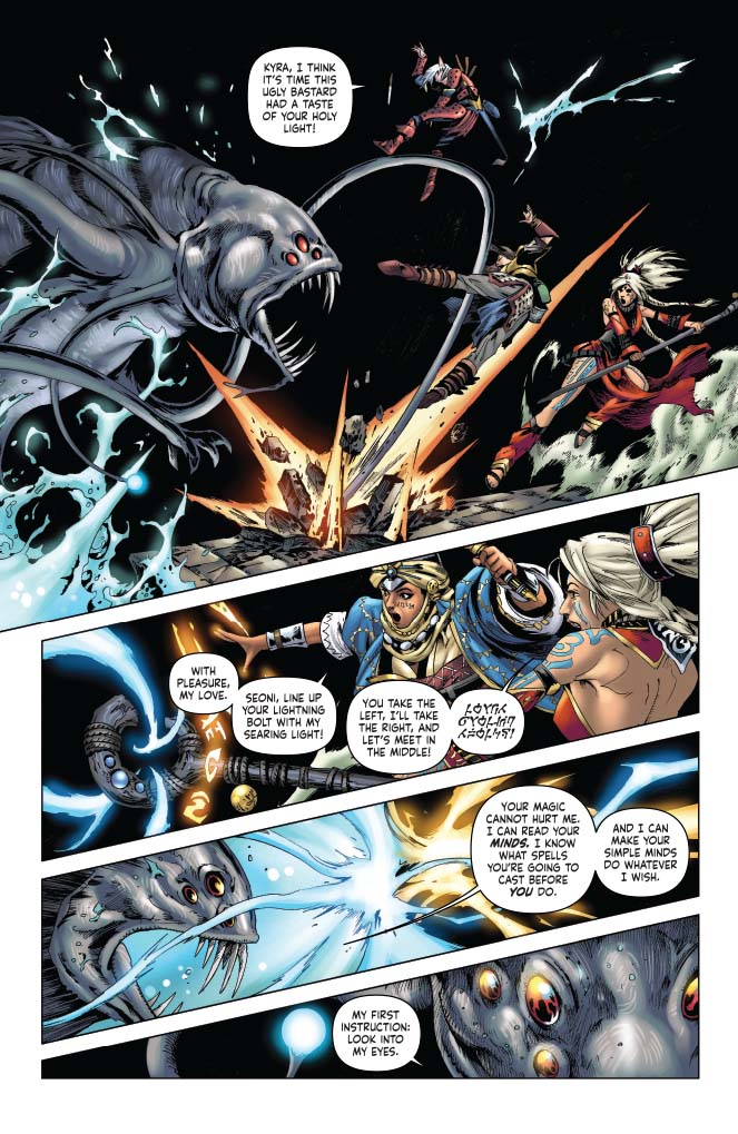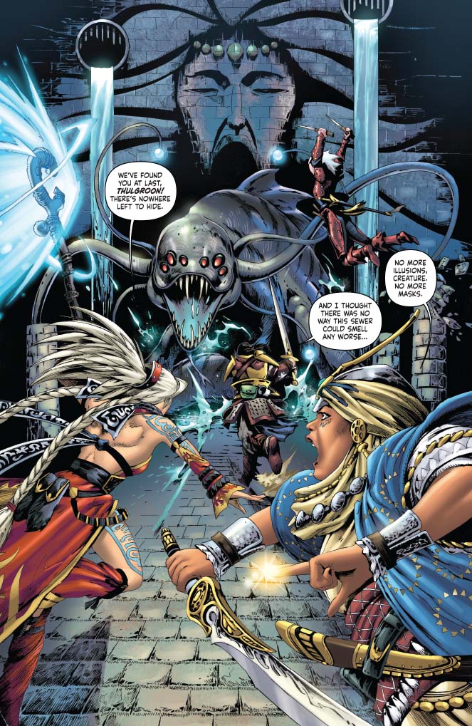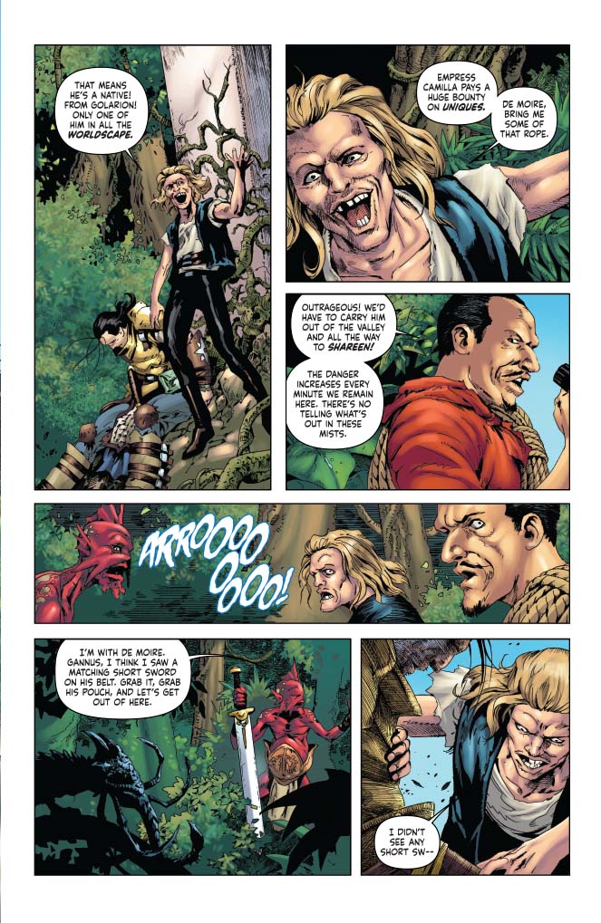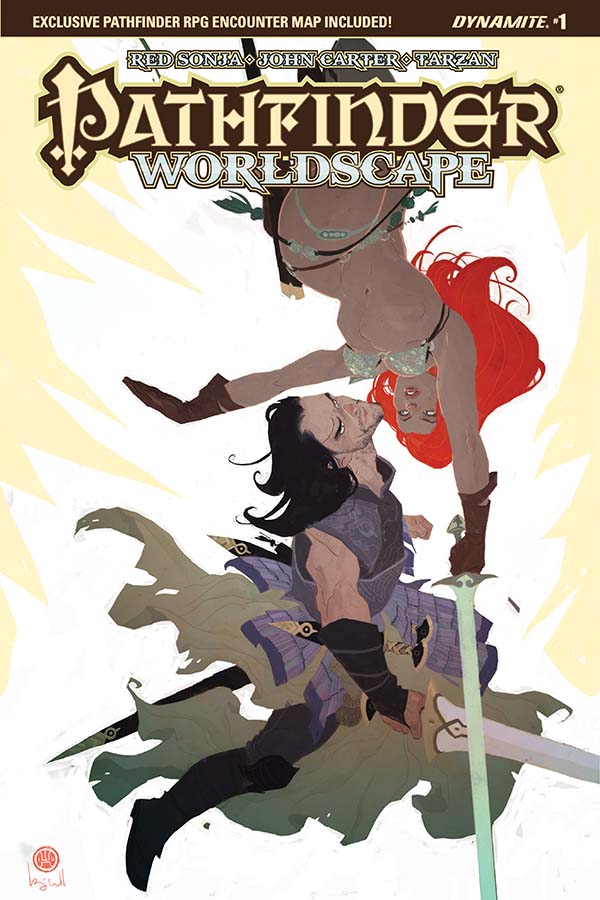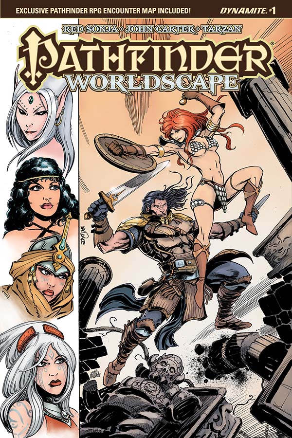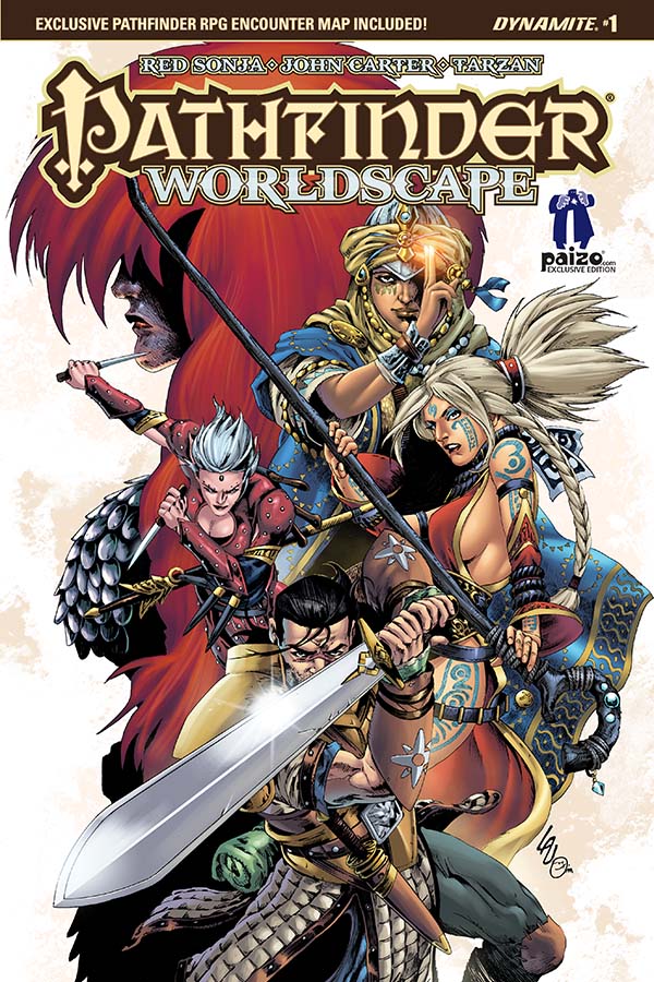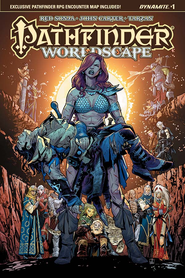 Rating: Teen + Cover A: Reilly Brown UPC: 725130252746 01011 Cover B: Ben Caldwell UPC: 725130252746 01021 Cover C Subscription: Sean Izaakse UPC: 725130252746 01031 Writer: Erik Mona Art: Jonathan Lau Genre: Fantasy, Adventure Publication Date: October 2016 Format: Comic Book Page Count: 32 Pages ON SALE DATE: 10/19 Into the Worldscape - Dynamite's fantasy adventure crossover event kicks off as the Pathfinders are drawn into the mysterious Worldscape, where the greatest Warriors of Hyboria, Barsoom, Golarion and Earth clash in an ancient battle of life and death! Magic, monsters, and mystery co-starring Red Sonja! The Worldscape beckons in a tale written by Pathfinder publisher Erik Mona (Pathfinder: Hollow Mountain) with art from Jonathan Lau (Red Sonja and Cub). Contains a Pathfinder RPG rules appendix and a bonus pull-out poster map! |