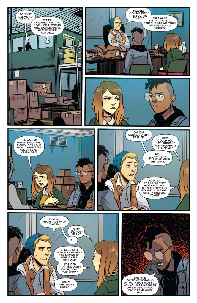 Rating: Teen + Cover A: Tula Lotay UPC: 725130267375 04011 Cover B: Jen Bartel UPC: 725130267375 04021 Cover C: Jenn St-Onge UPC: 725130267375 04031 Writer: Kelly Thompson Art: Jenn St-Onge Genre: Mystery Publication Date: September 2018 Format: Comic Book Page Count: 32 Pages ON SALE DATE: 9/12/2018 The bodies are piling up, the cops won't help, the suspects won't talk. Nancy and crew have one move: Infiltrate the PALACE OF WISDOM, a pop-up club full of danger and drugs. Will Nancy be able to crack the case before she, or one of her crew, is targeted next? The mystery goes deeper, by Eisner Award nominee KELLY THOMPSON (Hawkeye, West Coast Avengers) and JENN ST-ONGE (The Misfits, Giant Days). |
